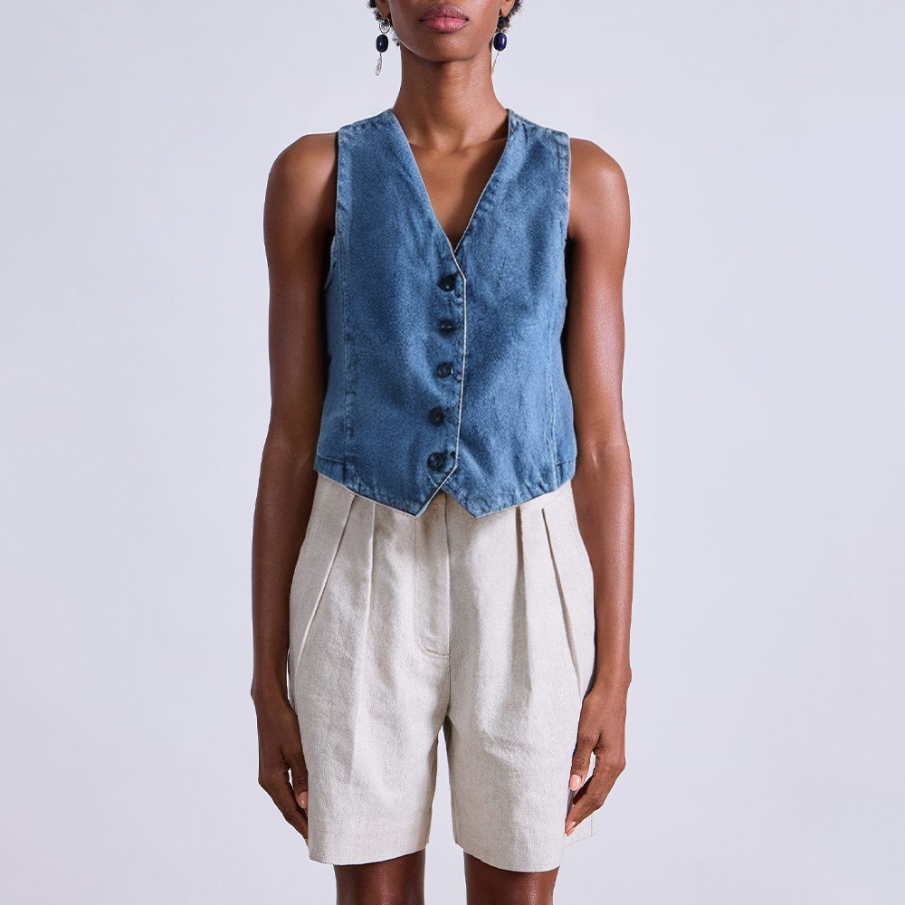 Details V-neck design: classic V-neck cut, elongating the neck line, showing an elegant and capable temperament. Sleeveless version: free and flexible, can be paired with shirts, long sleeves or dresses to create a layered look. Asymmetrical hem: fashionable asymmetrical cut, adding design and dynamics, enhancing the refinement of the overall shape. Button closure: front button opening and closing, easy to…